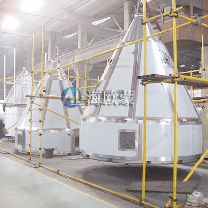 在噴霧干燥系統(tǒng)中,部分干粉在干燥室內(nèi)自由沉降至底部經(jīng)鎖氣閥分出;少部分細(xì)分隨尾氣攜出。從尾氣中分離出的乳粉形成回收系統(tǒng)。常用的**級分離器是旋風(fēng)分離器。